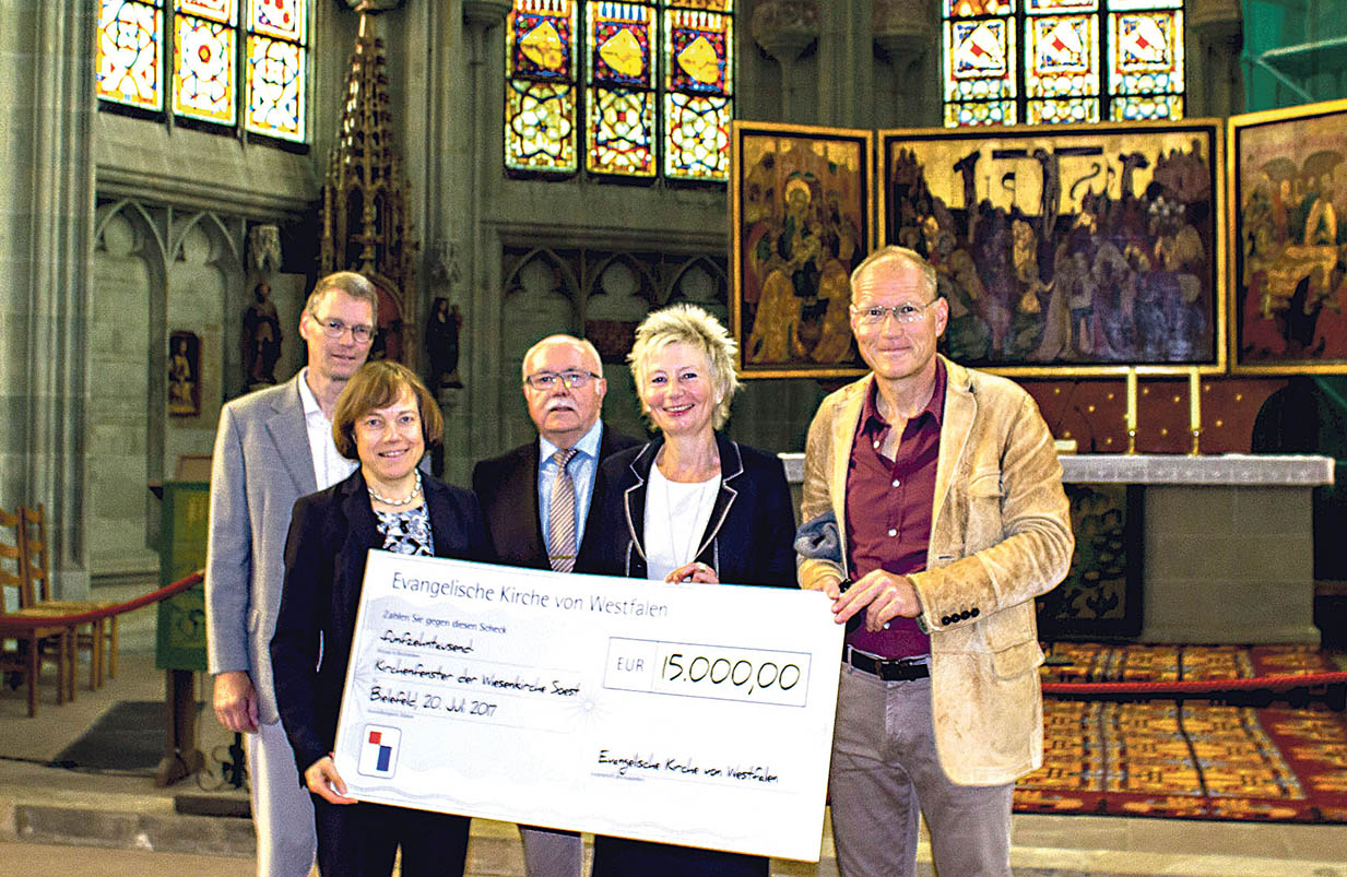SOEST – Die Evangelische Kirche von Westfalen (EKvW) hat 15 000 Euro für die Renovierung eines Fensters in der Wiesenkirche Soest gespendet. Präses Annette Kurschus übergab den symbolischen Scheck an Dombaumeister Jürgen Prigl, wie das Landeskirchenamt in Bielefeld mitteilte. Regierungspräsidentin Diana Ewert äußerte sich erfreut, dass die Landeskirche ihrer Bitte um finanzielle Unterstützung nachgekommen sei. Die Kirche St. Maria zur Wiese hat fünf farbig bemalte Glasfenster aus der Zeit um 1350. Die EKvW feiert den Abschluss des Reformationsjahrs in Westfalen am 31. Oktober mit einem Festgottesdienst in der Wiesenkirche, der vom WDR übertragen wird. epd