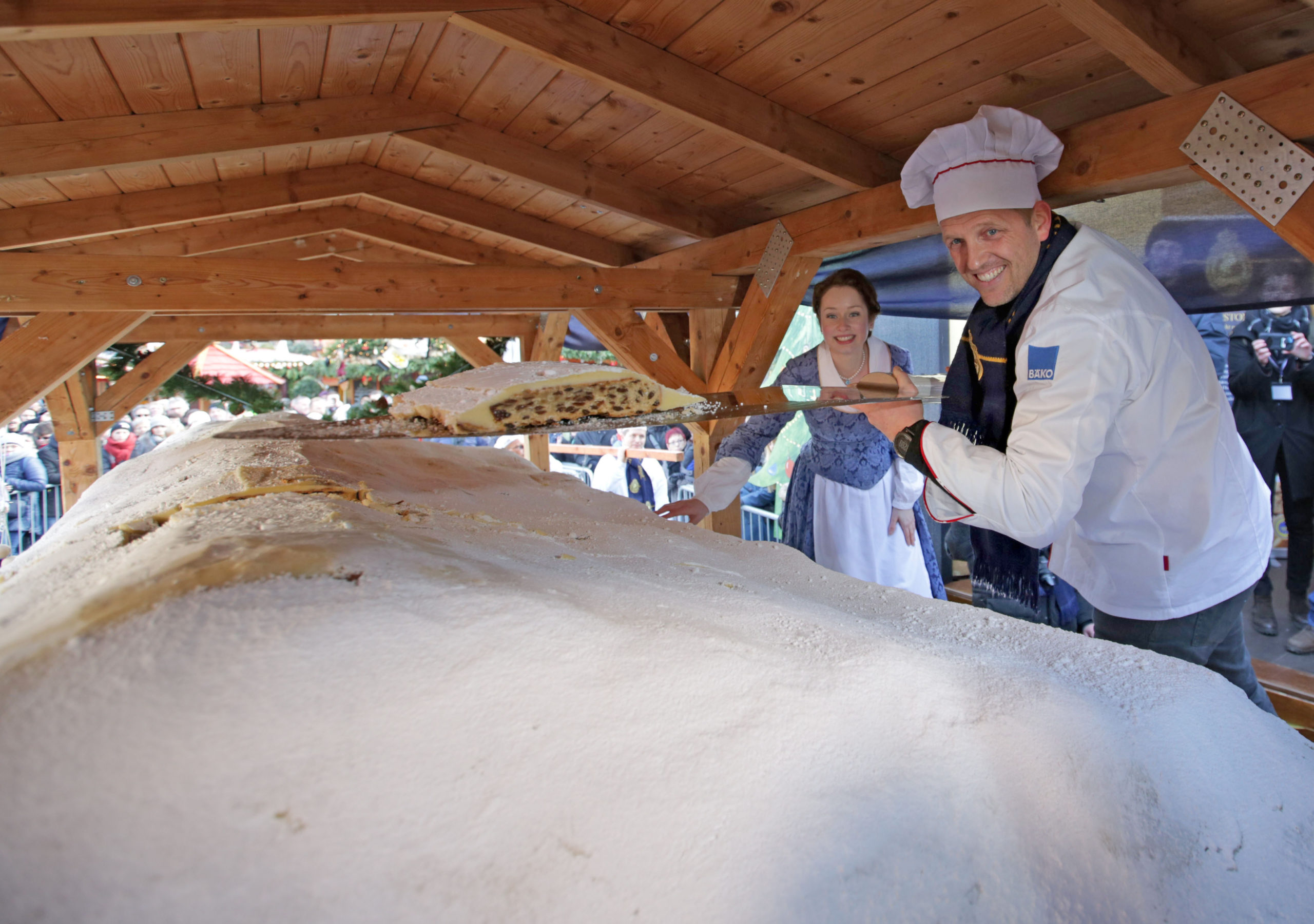 Der diesjährige «Riesenstriezel wurde den Angaben zufolge aus rund 359 Stollenplatten mit einer Größe von jeweils 40 mal 60 Zentimetern und einem Gewicht von je acht Kilogramm zusammengebaut. Die Zutatenliste summiert sich auf etwa eine Tonnen Mehl, 675 Kilogramm Butter, 180 Kilogramm Zucker sowie rund 1,35 Millionen Sultaninen.