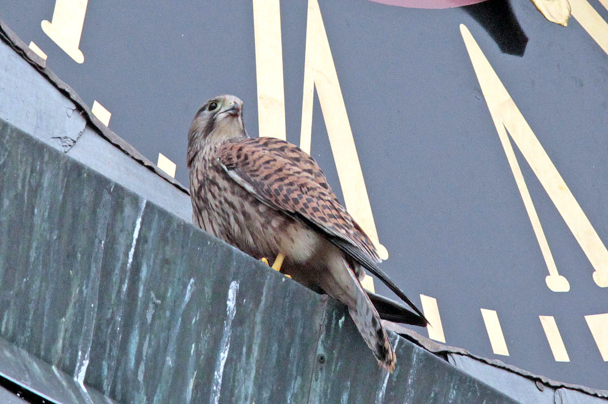 In Ummeln hieß es im dieses Jahr im März: Sie haben den Winter überstanden. Ab April: Sie brüten: Und einen Monat später: Sie sind ausgeschlüpft. Vor kurzem, konnte man sie auch von außen sehen. Da kam der Wunsch auf, sie zu fotografieren. Hobbyfotografin Barbara Klesse hat sich geduldig auf die Lauer gelegt. Sie erzählt: „Die Kleinen schauten erst ängstlich aus dem Flugloch, während die Falkenmutter unter dem Zifferblatt der Kirchturmuhr über allem wachte. „Mit gutem Grund“, sagt Hans Lagerquist, denn der große Uhu greift manchmal ein Küken. Aber alles ging gut. Die Falkeneltern zeigten ihrem Nachwuchs, wie das Jagen geht und bald gehen sie getrennte Wege.