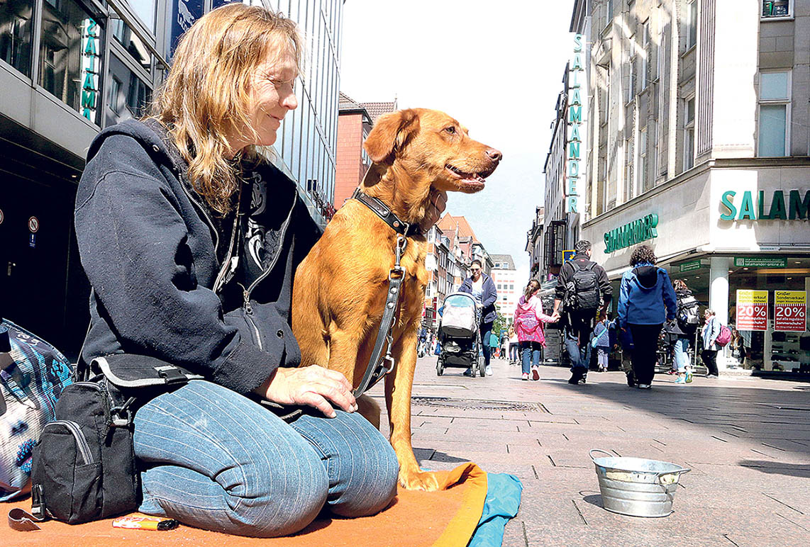 „Sitzung machen“, nennt das Marina, die sich gegen den Begriff „Betteln“ wehrt, weil er für sie abwertend, würdelos klingt. Unweit von Kurt hat sie für sich und ihre jugendliche Mischlingshündin Baffy in der Fußgängerzone eine Decke ausgebreitet. „Ich hab immer einen Hund an meiner Seite, ich kann gar nicht anders“, sagt die Frau, die seit 45 Jahren mit Vierbeinern zusammenlebt. Dafür nimmt sie in Kauf, auch für die Rechnung des Tierarztes auf der Straße betteln gehen zu müssen.