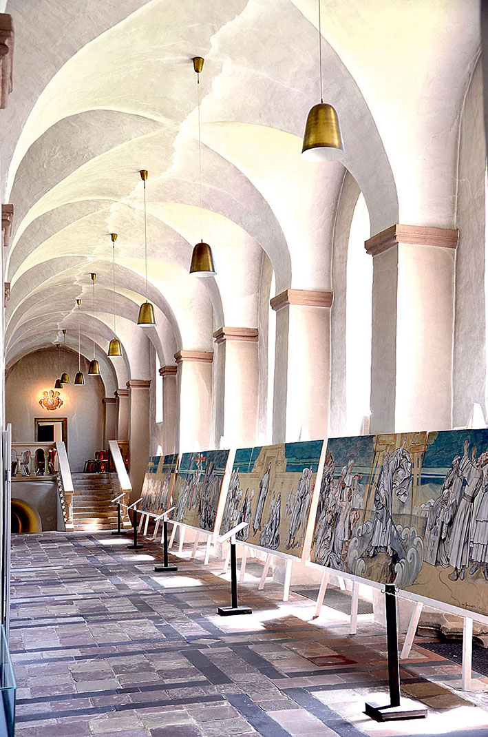 Von den Gemälden im Chorraum und auf dem Triumphbogen existieren heute nur noch Schwarz-Weiß-Fotografien und kleine Entwürfe. Im Rahmen der Sonderausstellung werden im südlichen Seitenschiff der Kirche fünf noch erhaltene originale Karton-Entwürfe für die Bemalung des Mittelschiffs auf Stellwänden gezeigt. Sie wurden in den 1980er Jahren auf Holzplatten aufgezogen und in je drei Teile geschnitten. Historische Fotos von der Ausmalung der Kirche vermitteln einen Gesamteindruck. Von den übrigen Bemalungen sind nur Fragmente der Entwürfe erhalten. Sie stammen weitgehend aus der Familie Pfannschmidt und werden in den Vitrinen präsentiert.