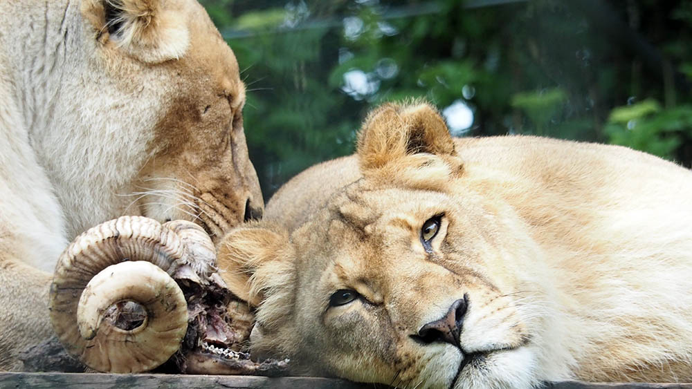Die Gemeinde sprang ein, weil sonst niemand auch nur Interesse zeigte. Was sich dann doch gelohnt hat, denn jetzt präsentiert sich der Zoo in einem ansprechenden Gewand, ist zu Recht Publikumsmagnet, wenn auch vielleicht eine etwas wilde Tiermischung zu betrachten ist: Es gibt zwei Löwinnen, einen Dingo-Hund und heimische Zwergotter. Kängurus teilen sich ihr Reservat mit Kunekune-Schweinen; Flamingos ihres mit Höckergänsen. Nebenan lärmen Makaken, und auf dem Dach des Kiosks hat sich ein Storchenpaar niedergelassen.