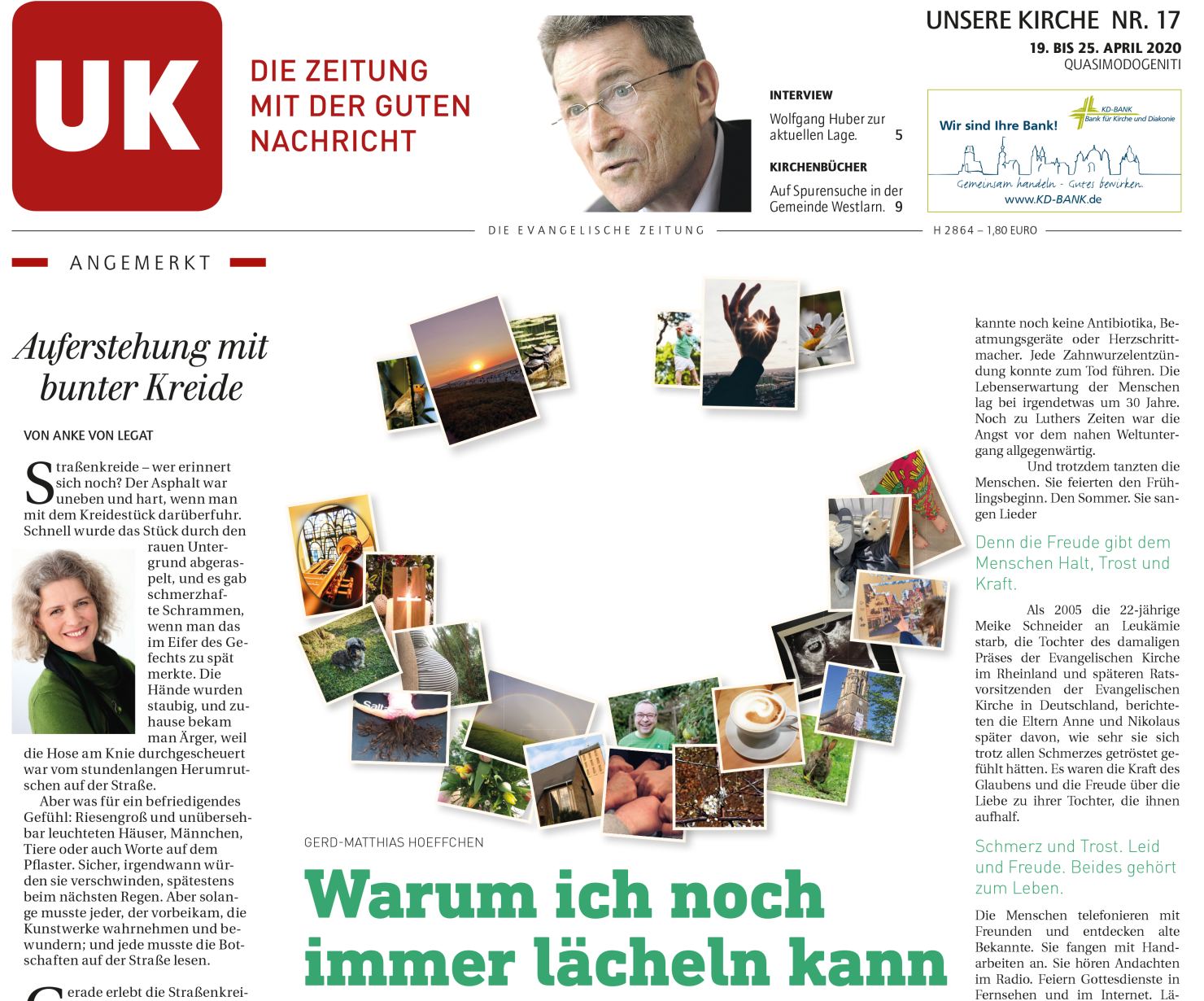 Die Menschen telefonieren mit Freunden und entdecken alte Bekannte. Sie fangen mit Handarbeiten an. Sie hören Andachten im Radio. Feiern Gottesdienste in Fernsehen und im Internet. Lächeln über eine Tüte mit Gaben an ihrer Haustür. Strahlen vor Freude, wenn unterm Fenster jemand ein Lied singt. Sie leben auf, wenn sich jemand erkundigt, wie es ihnen geht.