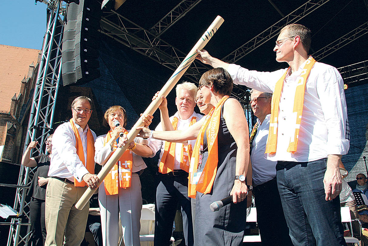 Ob es an den vielen Einladungen lag – vor der Bühne bei der Marienkirche hatten sich jedenfalls einige hundert Menschen versammelt, um die Staffelstabübergabe mitzuerleben. Worauf sie sich in Dortmund freuen dürfen, brachten am prägnantesten die beiden Nicht-Theologen Armin Laschet und Hans Leyendecker auf den Punkt: „Wenn es den Kirchentag nicht gäbe, müsste man ihn fast erfinden“, meinte der zukünftige NRW-Ministerpräsident Laschet. „Kirche muss sich einmischen. Schließlich ist die christliche Botschaft fast das Beste, was man der Welt anbieten kann.“ Und der Journalist Leyendecker, Präsident des Kirchentags 2019, sagte: „Wir treten beim Kirchentag nicht als eine gesellschaftliche Gruppe auf, sondern als Menschen, die vom Glauben reden.“