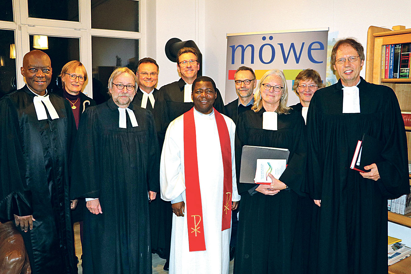 Pfarrer Jean-Gottfried Mutombo übernimmt das Regionalpfarramt für das Münsterland und die Region Hellweg. Die bisherige Regionalpfarrerin Beate Heßler ist künftig für neue Aufgaben im Amt für MÖWe in Dortmund zuständig. Zum Einführungsgottesdienst versammelten sich Jean-Gottfried Mutombo (Mitte), Beate Heßler (2. von rechts) sowie (von links:) Bischof Elie Kabwe Mulongo (Französisch-reformierte Kirche Stockholm), Angelika Veddeler (VEM, Wuppertal), Pfarrer Martin Mustroph (Münster), Pfarrer Ingo Neserke (Amt für Missionarische Dienste, Dortmund), Superintendent André Ost (Kirchenkreis Tecklenburg), Thomas Krieger, Pfarrerin Annette Muhr-Nelson (beide Amt für MÖWe) und Oberkirchenrat Ulrich Möller (Bielefeld).