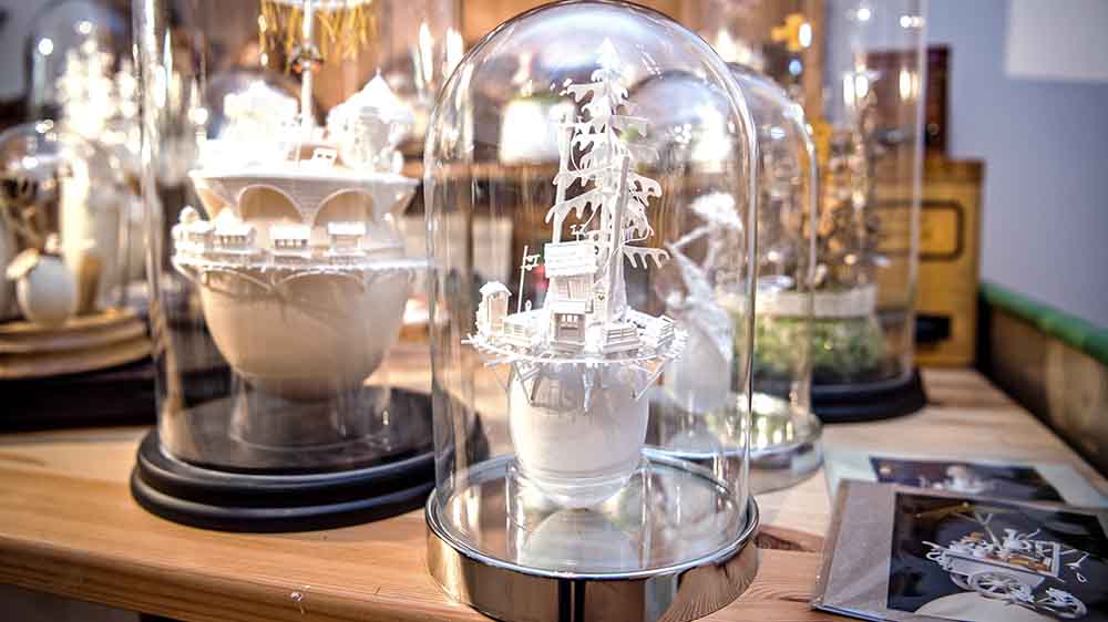 Dollases Liebe zum Detail zeigt sich bis in die kleinsten Winzigkeiten: Selbst die nur wenige Millimeter großen Topfpflanzen erhalten einzelne Blätter, die sie zuvor mit einem scharfen Bastelmesser zugeschnitten hat. Und wenn die fertige Gießkanne nicht auf das eine Ei passt, dann vielleicht auf das nächste. Verworfen oder abgebrochen hat sie noch keines ihrer Projekte: „Ich mache keine Versuche. Was ich anfange, bringe ich auch zu Ende.“