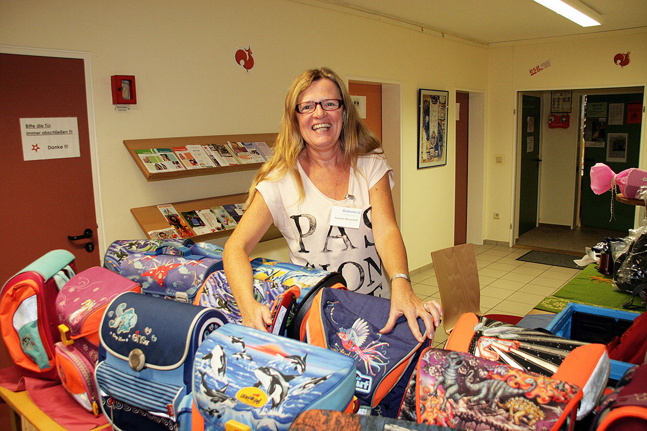 Sie hat sich auf den Weg gemacht in das evangelische Lukas-Gemeindezentrum in Paderborn. Dort ist die Schulmaterialienkammer im Keller untergebracht. Im Foyer gibt es Schultaschen und Rucksäcke – gebraucht und neu. „Die Tornister sind das Einzige, wofür wir einen festen Geldbetrag verlangen“, sagt Susanne Bornefeld.