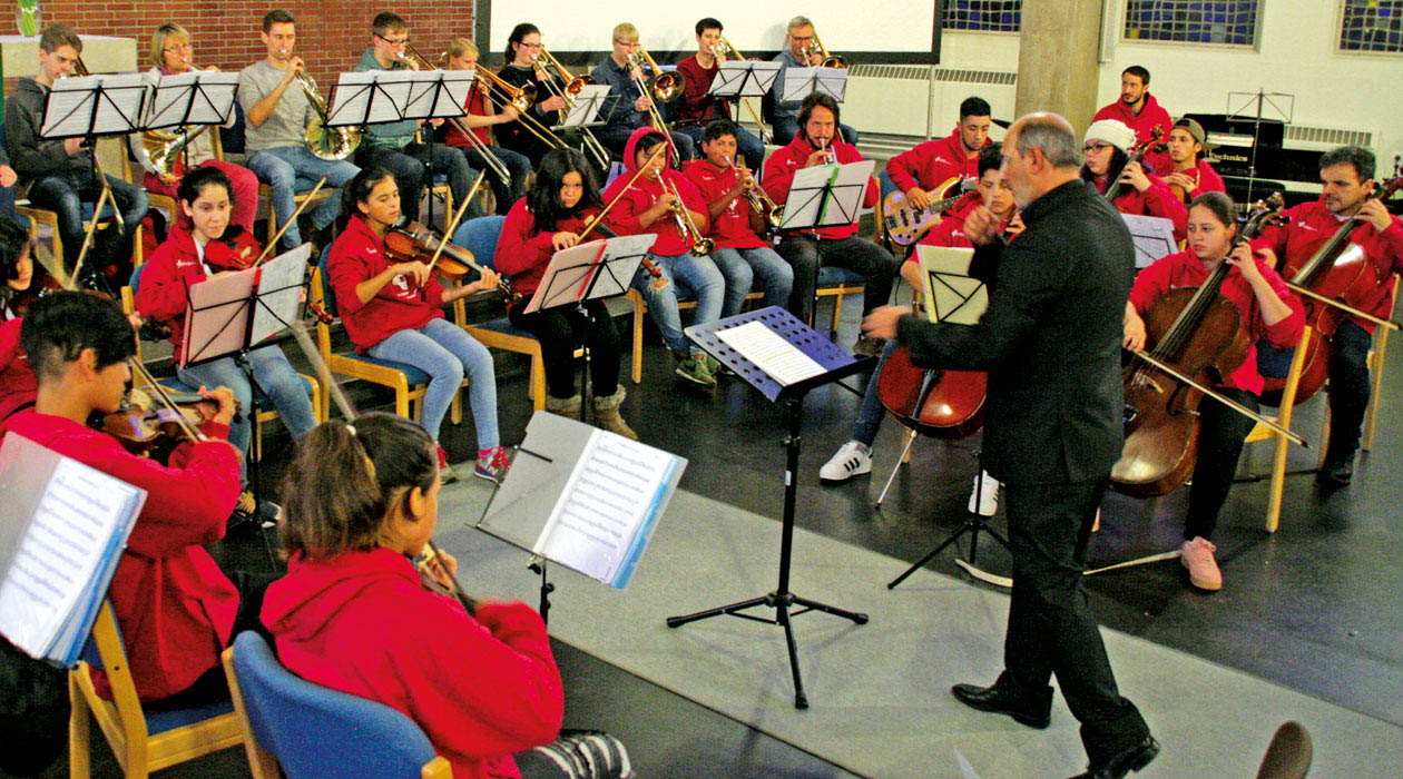 Das Jugendorchester „ASE Música“ tourt zwei Wochen lang durch Westfalen. An diesem Nachmittag ist eine Begegnung mit den Bläsern aus Bielefeld vorgesehen. Es geht um das gemeinsame Musizieren; vor allem aber auch um die Begegnung mit Gleichaltrigen aus einem anderen Kulturkreis.