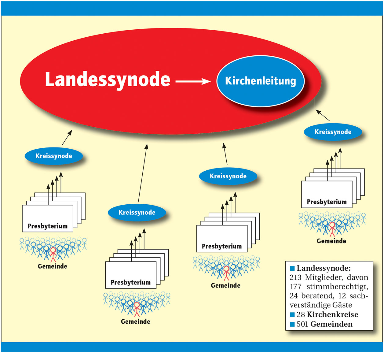 Das Amt des „Kirchenältesten“ (Übersetzung von „Presbyter) ist also eine verantwortungsvolle Aufgabe. Diese gemeinsame Leitungsfunktion von Hauptamtlichen und Ehrenamtlichen in der Kirche setzt sich auf allen Ebenen fort: Die Gemeinden entsenden aus ihren Presbyterien und Kirchenvorständen Vertreter auf die Kreisebene (Kreissynode oder Klassentag). Von dort werden erneut Vertreterinnen und Vertreter entsandt: nämlich in die Landessynoden, den höchsten Leitungsgremien der beiden Landeskirche (siehe Grafik). Und die Landessynoden schicken Abgesandte in die Synode der Evangelischen Kirche in Deutschland (EKD).