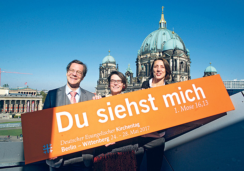 BERLIN – Der Deutsche Evangelische Kirchentag 2017 in Berlin und Wittenberg steht unter dem Leitwort „Du siehst mich“. Kirchentagspräsidentin Christina Aus der Au präsentierte in Berlin die Losung aus dem 1. Buch Mose, die über allen Aktivitäten des Kirchentages im Jahr des 500. Reformationsjubiläums stehen wird. Zu dem Christentreffen vom 24. bis 28. Mai 2017 werden in Berlin 140 000 und zum Abschlussgottesdienst in Wittenberg mehr als 200 000 Teilnehmer erwartet.