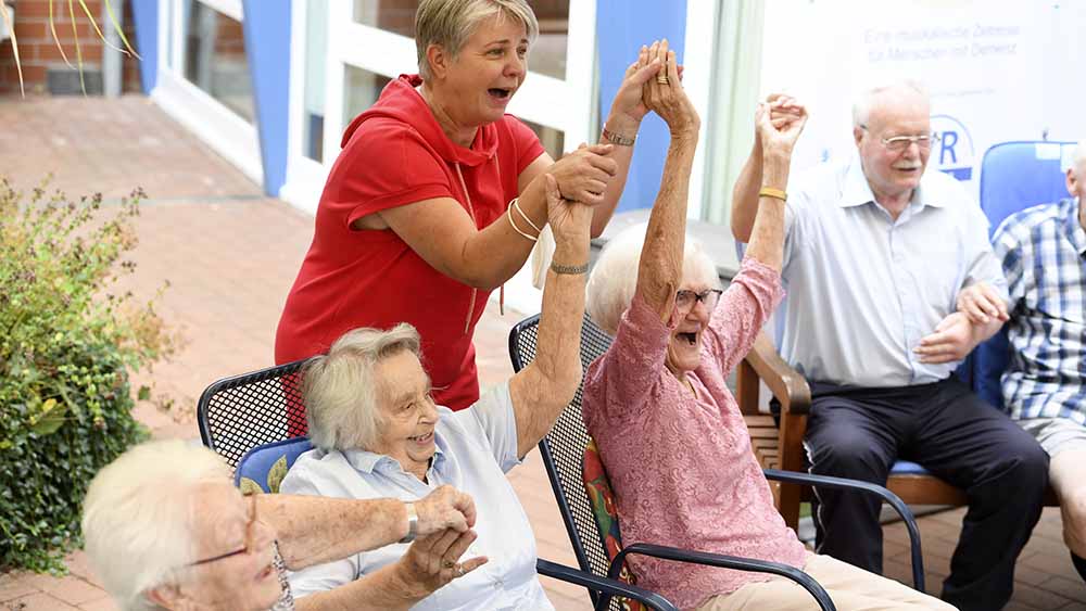 Wunstorf. Frau S. ist heute wieder gut drauf. Nach ein paar Takten erhebt sie sich vom Stuhl, neben dem sie den Rollator geparkt hat, schnappt sich ihren Gehstock und tänzelt im Rhythmus der Musik der Terrasse entgegen. Denn dort swingt die Band vom Team „Klang und Leben“ gerade einen Hit von früher: „Ich will keine Schokolade, ich will lieber einen Mann.“ Ein alter Schlager von Trude Herr aus dem Jahr 1960. Sänger Oliver Perau hat ihn im diakonischen „Haus am Bürgerpark“ in Wunstorf bei Hannover angestimmt, begleitet von Pianist und Schlagzeuger.