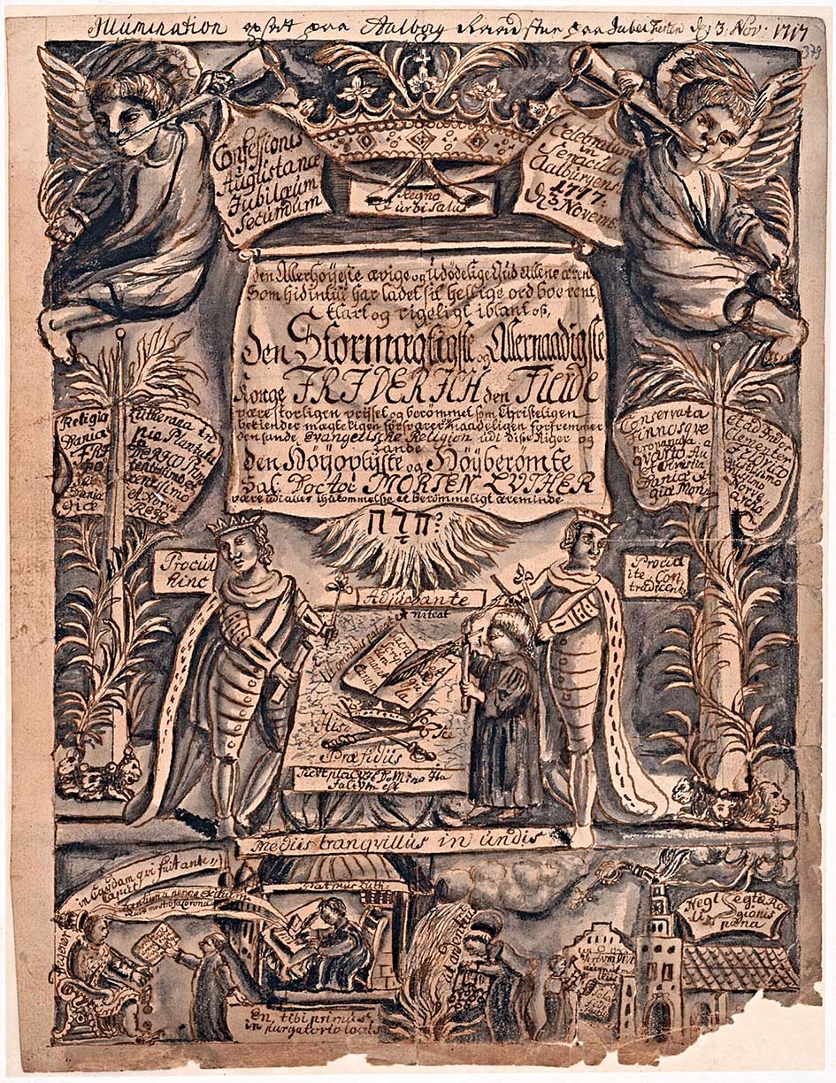 Darin schildert dieser die Reformationsfeierlichkeiten in Aalborg. Inklusive einer Zeichnung, die ein 1717 im Aalborger Rathaus ausgestelltes Schaubild wiedergibt. Darauf ist neben vielerlei Hinweisen auf Luthers Leben in der unteren rechten Ecke auch ein Mann mit einem Hammer zu entdecken. Cyprian ließ das 24 mal 19 Zentimeter große Bild in Kupfer stechen und veröffentlichte es 1719 in der Festschrift „Hilaria Evangelica“. Doch obwohl das Buch heute in fast allen Barock-Bibliotheken steht, hatte es die Wissenschaft aus den Augen verloren. Joachim Ott nahm es nun genauer unter die Lupe und suchte gezielt nach weiteren Hinweisen auf Luther und den Hammer.
