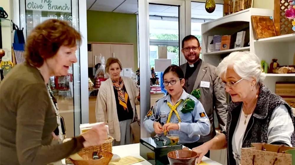 Heike Mardirian (rechts) mit Enkeltochter (in Pfadfinder-Kleidung) beim Verkauf im Gemeinde-Laden