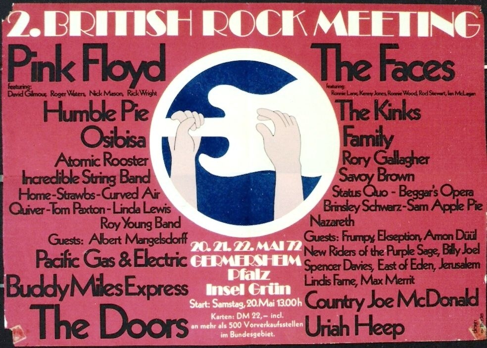 der Rheininsel im südpfälzischen Germersheim das «deutsche Woodstock» statt. Mit zwischen 70.000 und 100.000 musikbegeisterten jungen Leuten war das «2. British Rock Meeting» das damals größte Rockfestival in Deutschland.