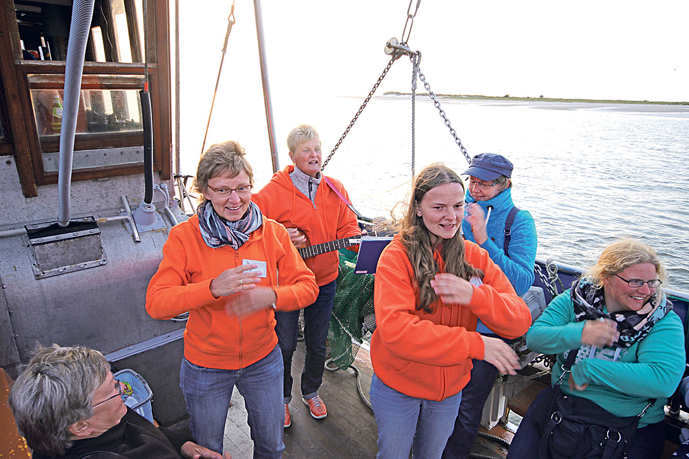 Gut zwei Stunden dauert die Fahrt von Neuharlingersiel Richtung Spiekeroog und Langeoog. Im Windschatten der Inseln stoppt „Käpt‘n Willy“ den Motor. Heike Pendias greift zur Gitarre. Auch bei den letzten Gästen siegt die Begeisterung über das leichte Unwohlsein – jetzt, wo Hände und Augen keinen Halt mehr brauchen. „Wir sollen Gott vertrauen und unser Leben in seine Hände geben“, sagt die 18-jährige Tabea aus Remscheid, die zusammen mit ihrer Mutter Anja Günther die Andacht hält. Die beiden verstärken in diesem Jahr das „Kirche-Unterwegs“-Team von Heike Pendias auf dem Campingplatz.