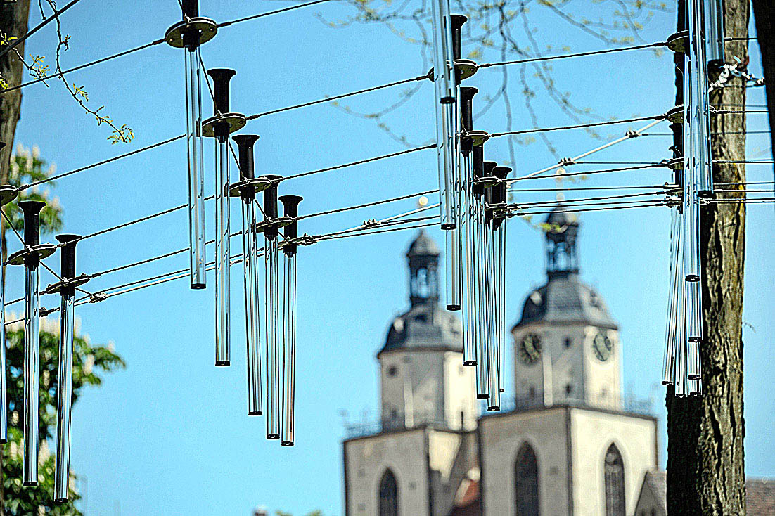 Wer am Hauptbahnhof mit dem Rundgang durch und um die Lutherstadt beginnt, kann zunächst einen „Perspektivwechsel“ wagen. Ein 30 Meter hoher Aussichtsturm bietet einen Überblick über die Altstadt mit ihren vielen Kirchtürmen und auf den grünen Gürtel der Wallanlagen. Im Mantel einer bedruckten Plane sieht der Turm aus wie die Neuauflage der 2017 erschienenen Lutherbibel.