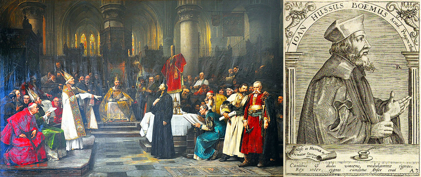 1414 wurde ein neuer Versuch unternommen, die Kirchenspaltung durch die Parallel-Päpste zu überwinden. Ein Konzil wurde nach Konstanz einberufen, weit genug entfernt von den päpstlichen Machtzentren und unter der Obhut des neugewählten deutschen Königs Sigismund (1411-1437). Dieser hatte Hus freies Geleit zugesagt, damit er seine Anliegen vorbringen könne. In seiner Abwesenheit wurde Hus jedoch gefangengenommen. Um das Konzil aber nicht zu gefährden, schritt Sigismund nicht ein. So wurde Hus als Ketzer angeklagt und, da er nicht widerrufen wollte, als solcher verbrannt.