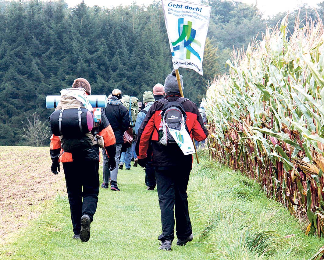 Gut 150 Frauen und Männer in wetterfester Kleidung hatten am selben Morgen, von Osnabrück her kommend, Nordrhein-Westfalen erreicht. „Geht doch!“ – unter diesem Motto wandern manche auf dem Klimapilgerweg nur einen kurzen Abschnitt mit, manche ein paar Tage, einige legen die gesamten 1470 Kilometer von Flensburg nach Paris zurück. Nach dem Start im Juni am Nordkap führt der Weg nun durch Deutschland.