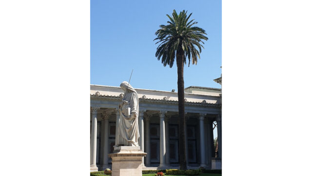 Los ging die jüngste Etappe in Rom. Es gab Zeiten, in denen mussten Pilger dort in allen sieben Pilgerkirchen gewesen sein. Brandy sieht das nicht so eng. Nur den Besuch in „seiner Kirche“ lässt er sich nicht nehmen: San Paolo fuori le Mura – Sankt Paul vor den Mauern. Es ist vor allem der Vorhof der Kirche, der Brandy berührt. „Umfriedet, schön bepflanzt, ein Ort großer Ruhe in dieser hektischen Stadt. In der Mitte ein Standbild des Paulus, der hier begraben sein soll.“ Damit ist Brandy auf seiner Pilgerreise bei den Anfängen des Christentums angekommen.