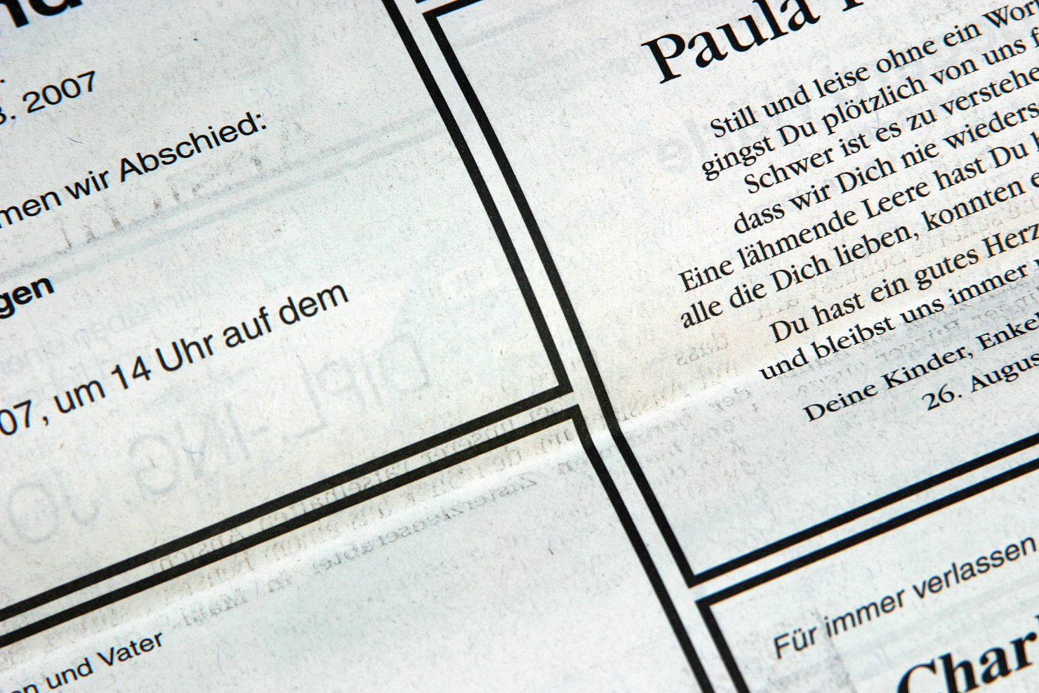 So bildet manch einer inzwischen einen QR-Code auf der Anzeige ab, der zu weiteren Infos über den Verstorbenen leitet. Andere entscheiden sich als Rahmen für rosa Elefanten. Eher eigentümlich für Außenstehende wirkt es, wenn Tiere als Inserenten auftreten. So wie Ronny, der sein „geliebtes Herrchen“ vermisst. Oder Rocky und Oscar, die den Tod ihres „Frauchen Moni“ bekannt geben, umrahmt von Tatzenabdrücken. Und manche Anzeige nimmt einen Perspektivwechsel vor und stellt nicht den Verstorbenen, sondern die Hinterbliebenen in den Vordergrund: „Es gibt keinen Grund, um ihn zu trauern, nur um uns, weil wir ihn verloren haben.“