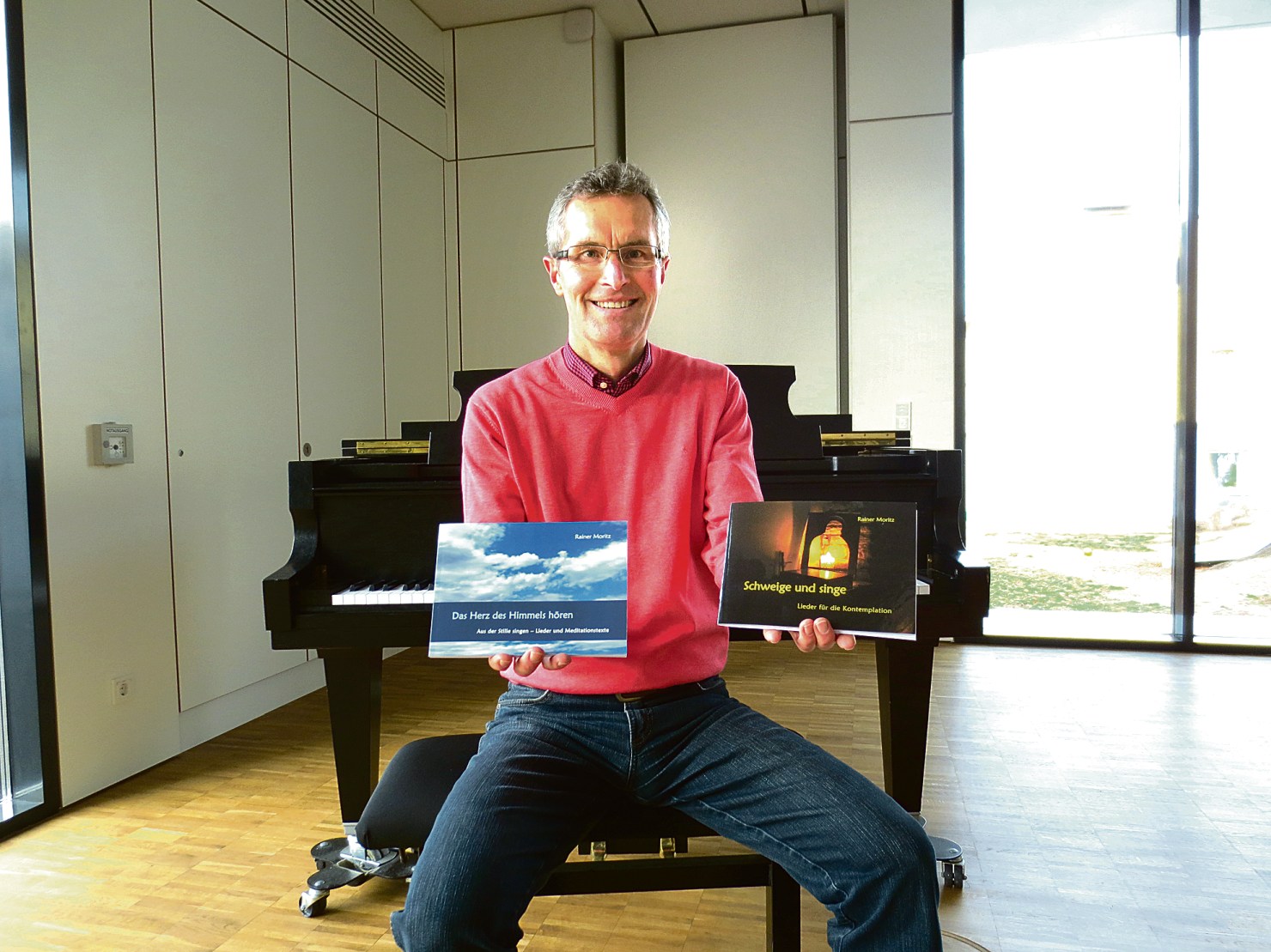 Kein Wunder also, dass Rainer Moritz inzwischen auch Lieder schreibt und komponiert. Vor Kurzem hat er zwei Bücher herausgebracht mit kurzen Liedern, die in die Stille führen sollen. Denn neben der Musik liegt ihm Meditation am Herzen. „In meinem Zivildienst bin ich damit in Berührung gekommen und es hat mich nicht mehr losgelassen.“ Es folgten Fortbildungen zu Themen wie „Meditation in der Gemeindearbeit“ und zum Herzensgebet, bei dem ein Gebetswort oder Satz immer wiederholt wird. „Seit 1996 biete ich Meditation in verschiedenen Formen in der Gemeinde an.“