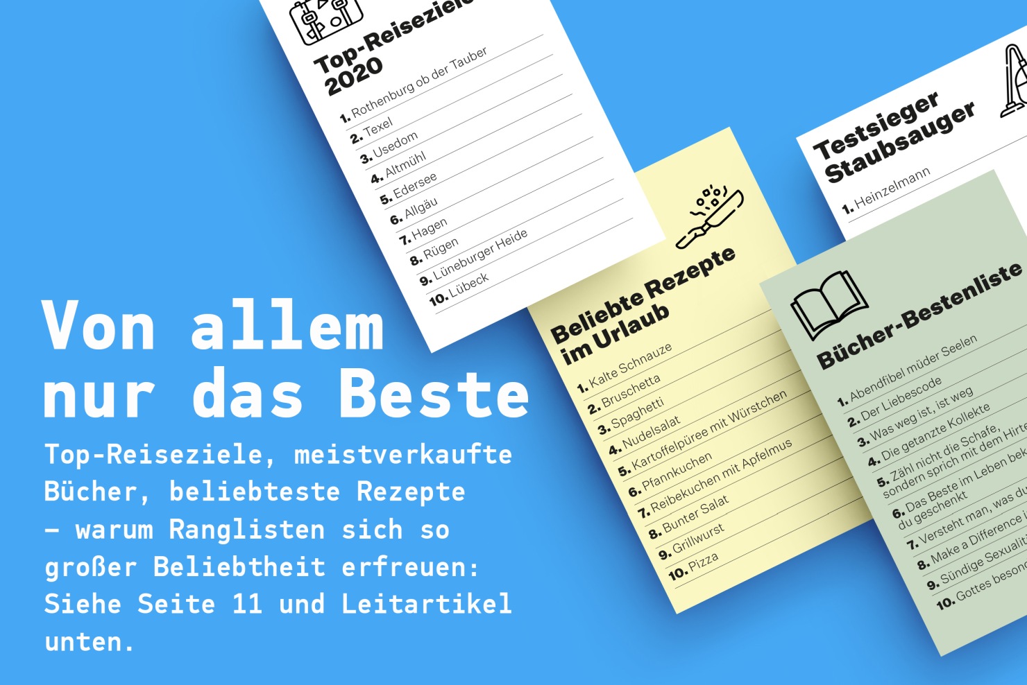 Bestenlisten sind beliebt. Gerade bei Büchern. Egal ob Sachbücher oder Belletristik. Aber auch in der Musik gibt es die „Top-Ten“ – seit 80 Jahren ein fester Begriff. Oder auch mal die „Top-Five“ oder „Top-Hundert“. Auch Listen der beliebtesten Urlaubsziele, witzigsten Geschenkideen für den Rentner oder erfolgreichsten Abnehm-Tipps kommen gut an.