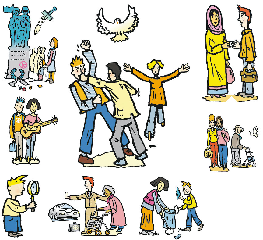 Herzstück der Sammlung ist ein sehr lebendiges und in der Praxis gut nutzbares Wimmelbild, das der Künstler Rüdiger Pfeffer extra für diesen Zweck gemalt hat. Darauf laden über 30 einzelne Szenen ein, ganz wortwörtlich Frieden zu suchen und sich ihm phantasievoll anzunähern.