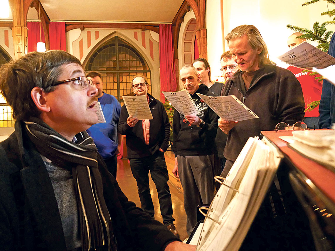 Wenn Kirchenmusiker Stefan Lepping sich an das schon etwas betagte Klavier setzt und mit energischer Stimme zur Ruhe mahnt („Quatschen könnt ihr gleich beim Kaffee“), legen die Männer eine erstaunliche Disziplin an den Tag und folgen Leppings Anweisungen ohne Murren.