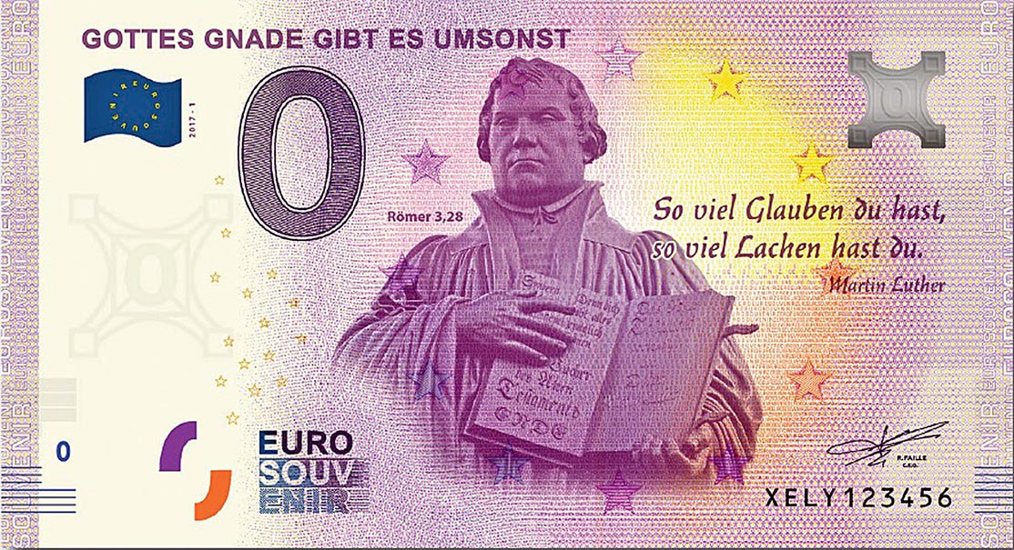 Überraschenderweise hat dann der ursprüngliche Satz „Gottes Gnade gibt es umsonst“ auch noch Platz auf dem Geldschein gefunden. „Da haben wir uns gefreut, als wir das festgestellt haben.“ Und im Katalog heißt der Schein nicht etwa Luther- oder Reformations-Euro, sondern ist gelistet unter: „Gottes Gnade gibt es umsonst.“