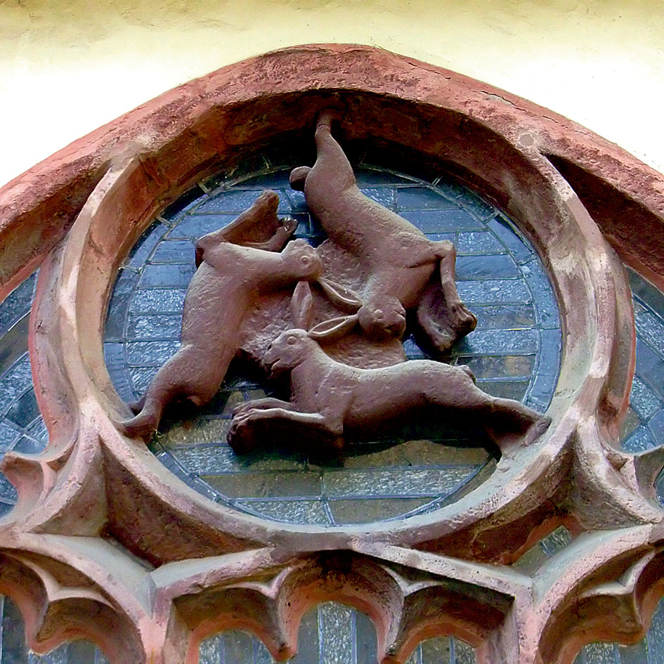 Die Autorin hat das Paderborner Dreihasenfenster als treffenden Vergleich herangezogen. Die im Kreis angeordneten Hasen sind ja mit ihren Ohren verbunden. Bei genauer Betrachtung ist es deutlich festzustellen, dass es der Hasen und der Löffel drei sind, aber dennoch jeder Hase zwei Löffel hat.