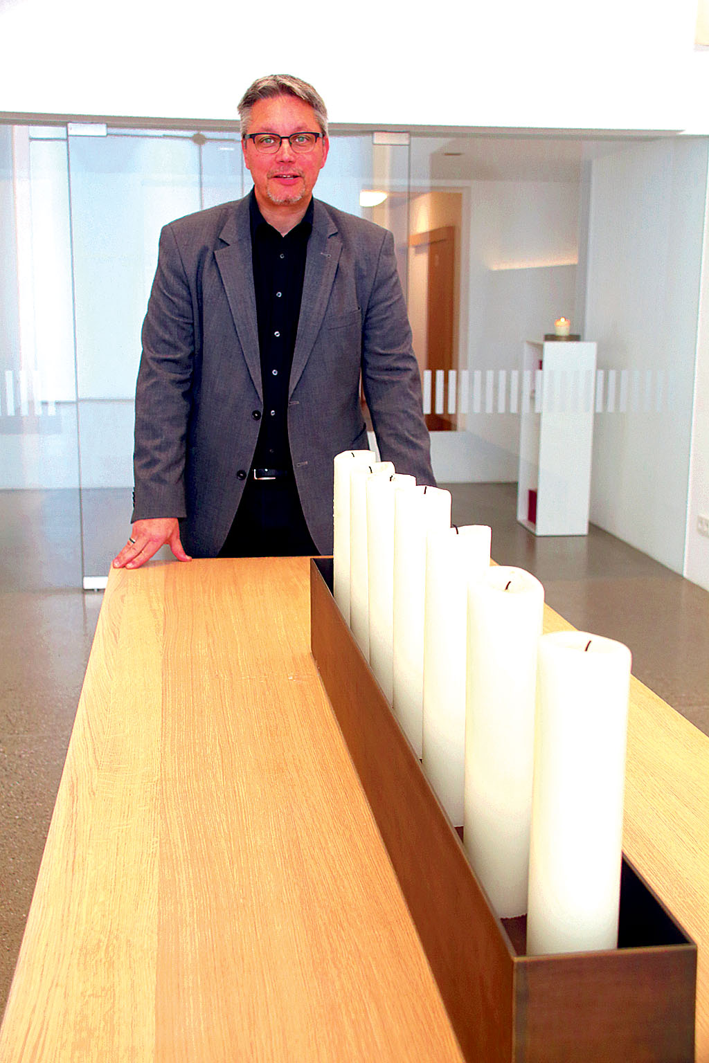 Der Stil des „Raumes der Stille“ entspricht ganz der Gestaltungslinie, für die die SOAN-Architekten bekannt sind. Schlichte Architektur, klare Formen, Licht. Der einzige Schmuck: das Kreuz im Glasfenster an der Stirnseite und die Kerzen auf dem Altartisch im Zentrum. Hier ist der Mensch auf sich selbst zurückgeworfen, sagt Gido Hülsmann.