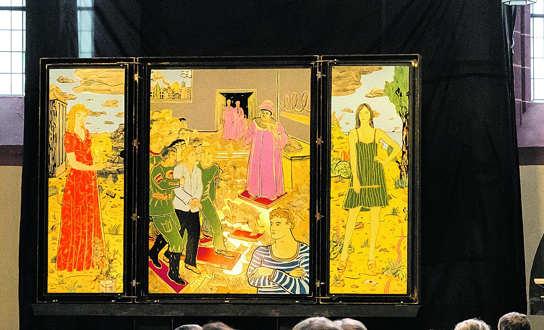 Erfurt – Die Erfurter Michaeliskirche hat im Rahmen einer Kunstaktion für die Dauer der Fastenzeit einen neuen Altar bekommen. Das Kunstwerk „Jesus vor Kaiphas“ von Moritz Götze verstellt bis zum Osterfest den Blick auf den eigentlichen Altar der früheren Universitätskirche der Landeshauptstadt. Zudem sind an den Wänden der Kirche weitere Bilder von Götze und ein von ihm gestalteter Luther-Flipper zu sehen.
