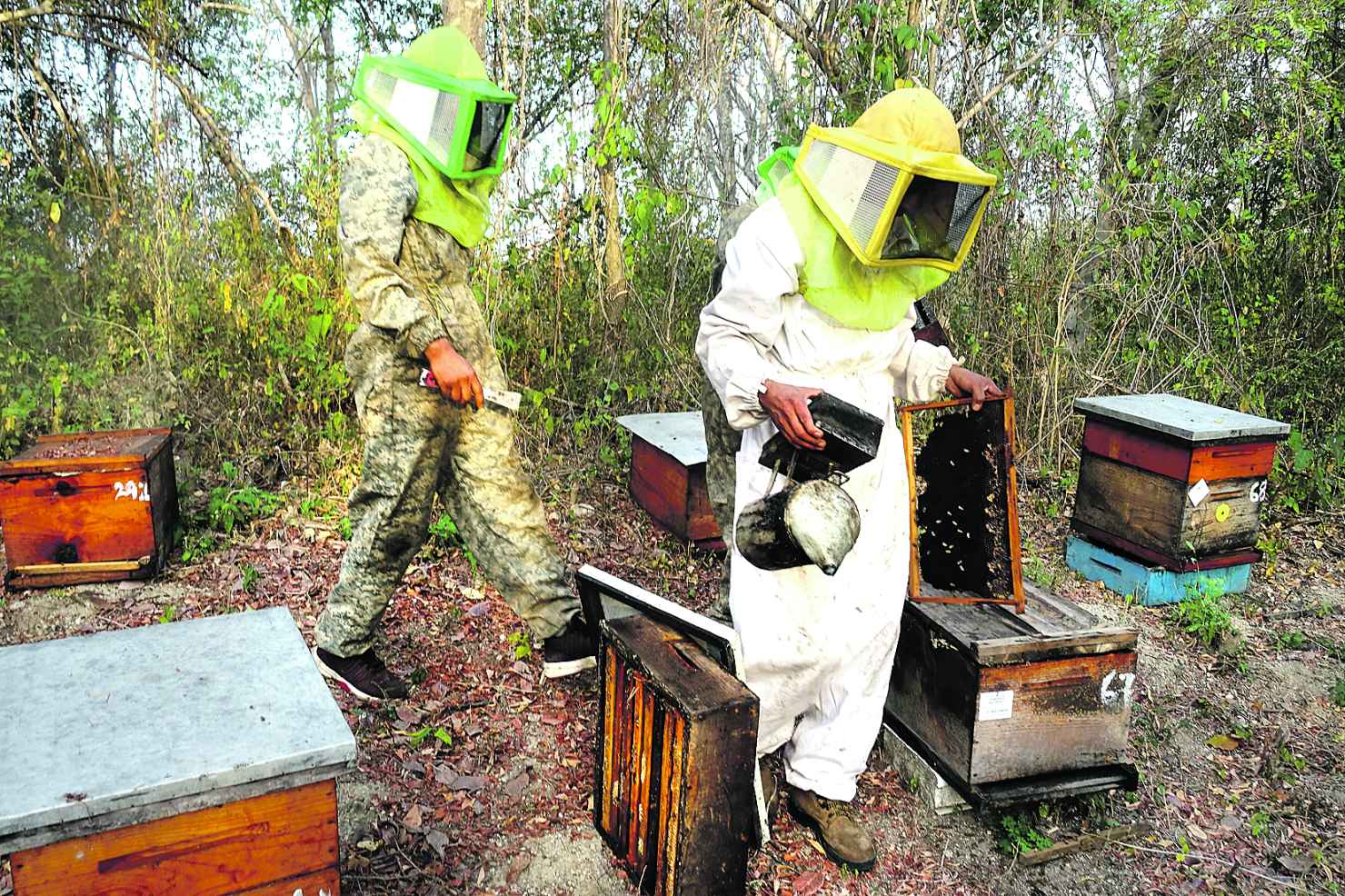 In seinem weißen Overall, das Gesicht durch eine fein vergitterte orangefarbene Haube geschützt, steht García mitten in einem Schwarm der angriffslustigen Insekten und bläst mit einer kleinen Pumpe Rauch in die Holzkästen. „Wenn man die Bienen nicht einräuchert, werden sie so aggressiv, dass kein Arbeiten möglich ist“, sagt der 28-Jährige. Unterdessen stapeln seine Kollegen die wertvolle Ware auf die Ladefläche des Geländewagens.