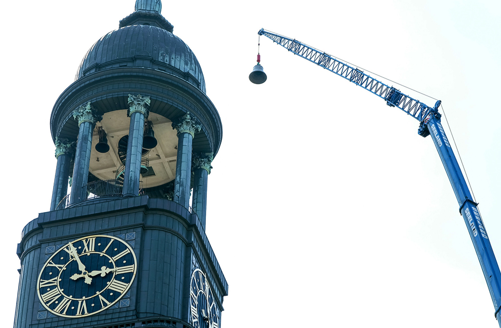 Millimetergenaue Maßarbeit war nötig, um die Glocken oben auf der Turmplattform abzusetzen. Kurz nach 14 Uhr war die erste Glocke oben, gegen 15 Uhr folgte die zweite. Mit Flaschenzügen werden sie in den nächsten Tagen in ihre Position unter der Turmkuppel gebracht. Laut Michel-Hauptpastor Alexander Röder können die Montagearbeiten noch knapp zwei Wochen dauern. Dabei werde es auch zu Einschränkungen des Turmbesuchs kommen.