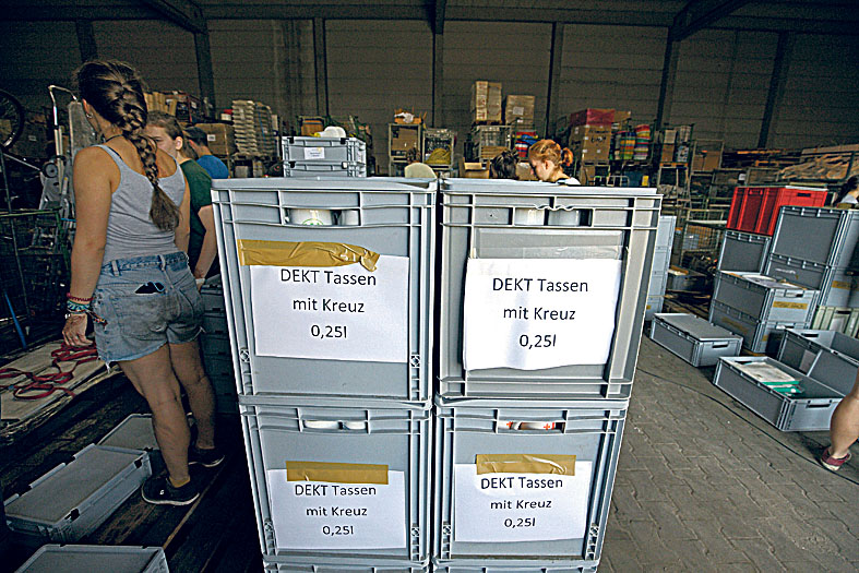 Auch beim Deutschen Evangelischen Kirchentag geht nichts ohne Hochstapelei. Bei der Inventur der Lagerbestände für das 36. große Protestantentreffen im Mai in Berlin und Wittenberg stapeln sich in einer Berliner Lagerhalle auf 1200 Quadratmetern große Boxen mit Aufschriften wie „Brotmesser“, „Einwegschürzen“, „Schwammtücher“ oder wie „DEKT Tassen mit Kreuz 0,25 l“.