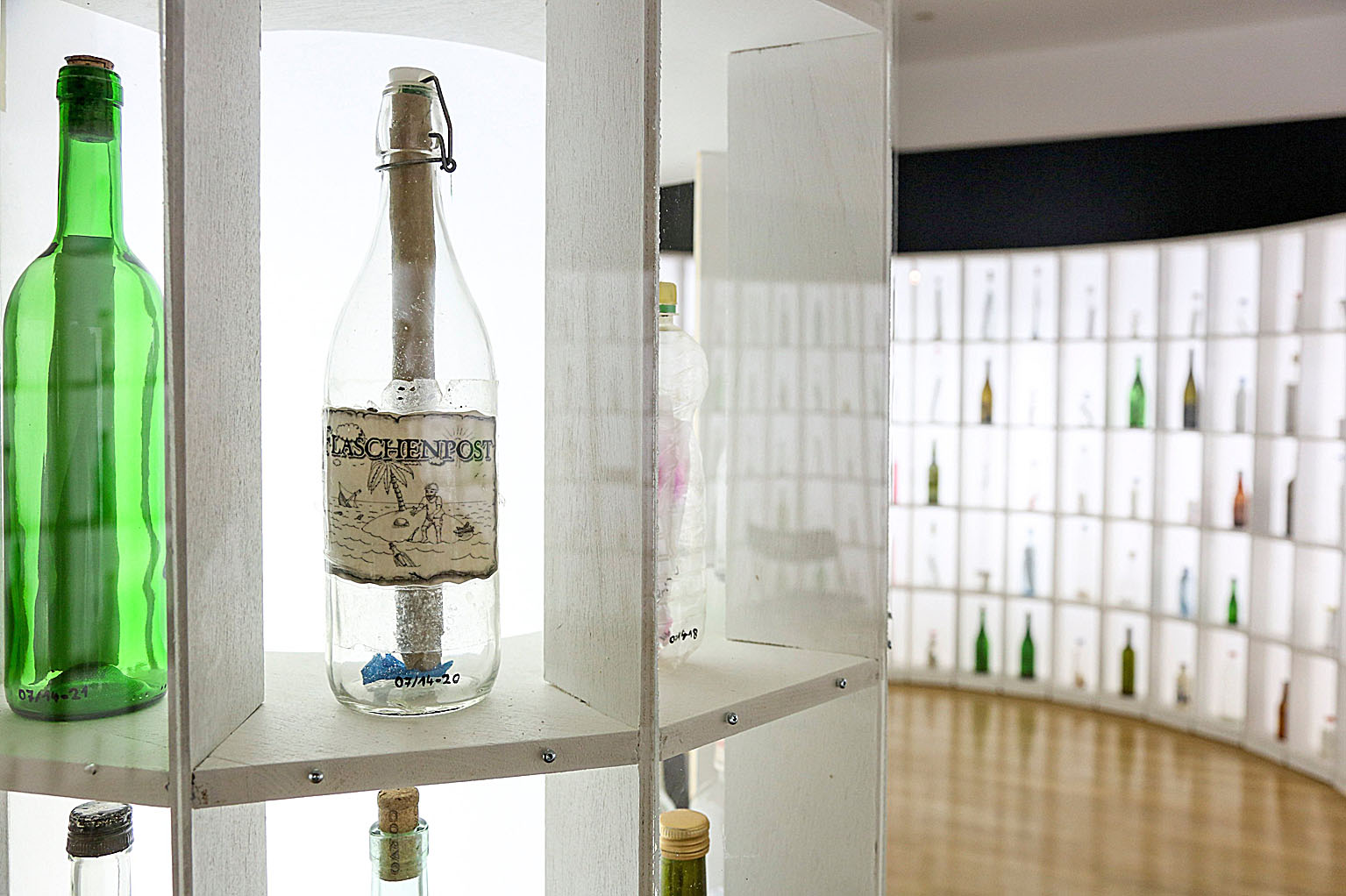Die Ansammlung von Flaschen und Behältnissen aller Art geht zunächst auf Distanz zum Betrachter. Jedes Exponat steht in seinem eigenen Fach – unnahbar hinter Glas in der wellenförmig geschwungenen Vitrine mit fünf Etagen, die sich durch den ganzen Ausstellungsraum im Historischen Museum am Strom zieht. Die Botschaft in den Flaschen selbst bleibt dem Publikum verborgen. Zunächst jedenfalls. Zu sehen sind nur die unterschiedlichen Formen, Farben und Materialien.