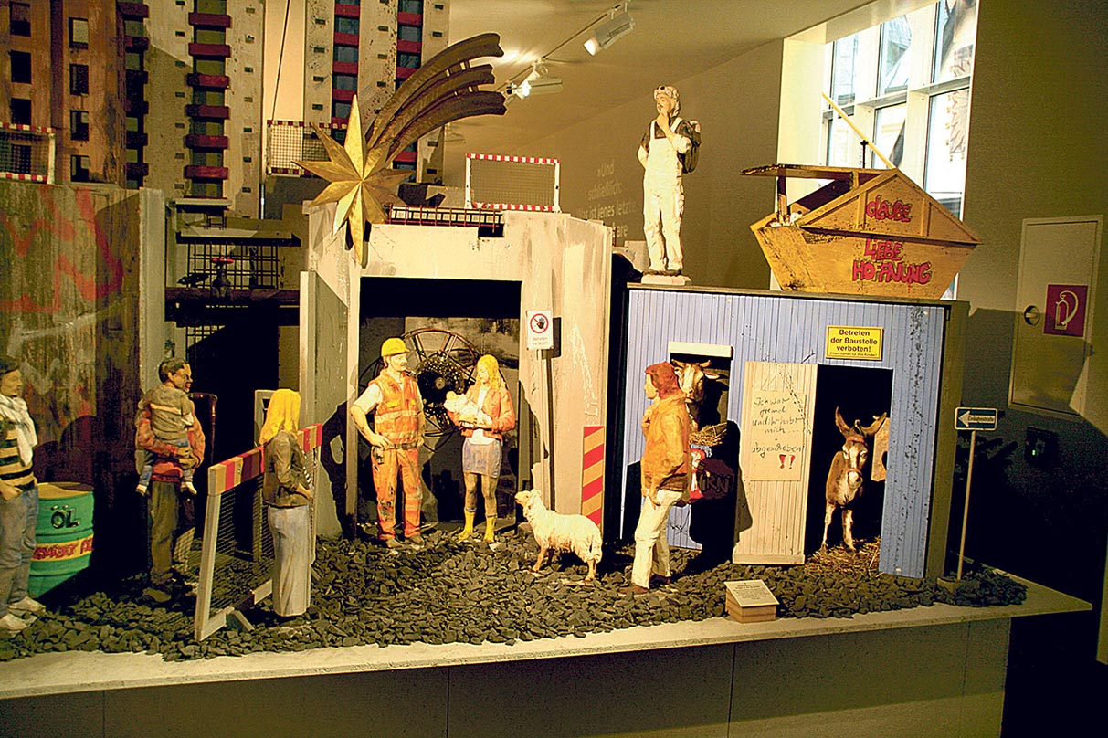 Die außergewöhnliche großformatige „Krippe in der Baustelle“ des Künstlers Rudi Bannwarth empfängt den Besucher der aktuellen, über 120 Werke umfassenden 77. Krippenausstellung im Westfälischen Museum für religiöse Kultur „Religio“ im münsterländischen Telgte. Dort ist sie noch bis zum 28. Januar zu sehen. Die biblische Weihnachtsbotschaft „Friede auf Erden“ auf Basis des Lukasevangeliums – Thema der Schau in diesem Jahr – hat der Holzbildhauermeister aus Ettlingen in den Alltag der Menschen heute übersetzt.
