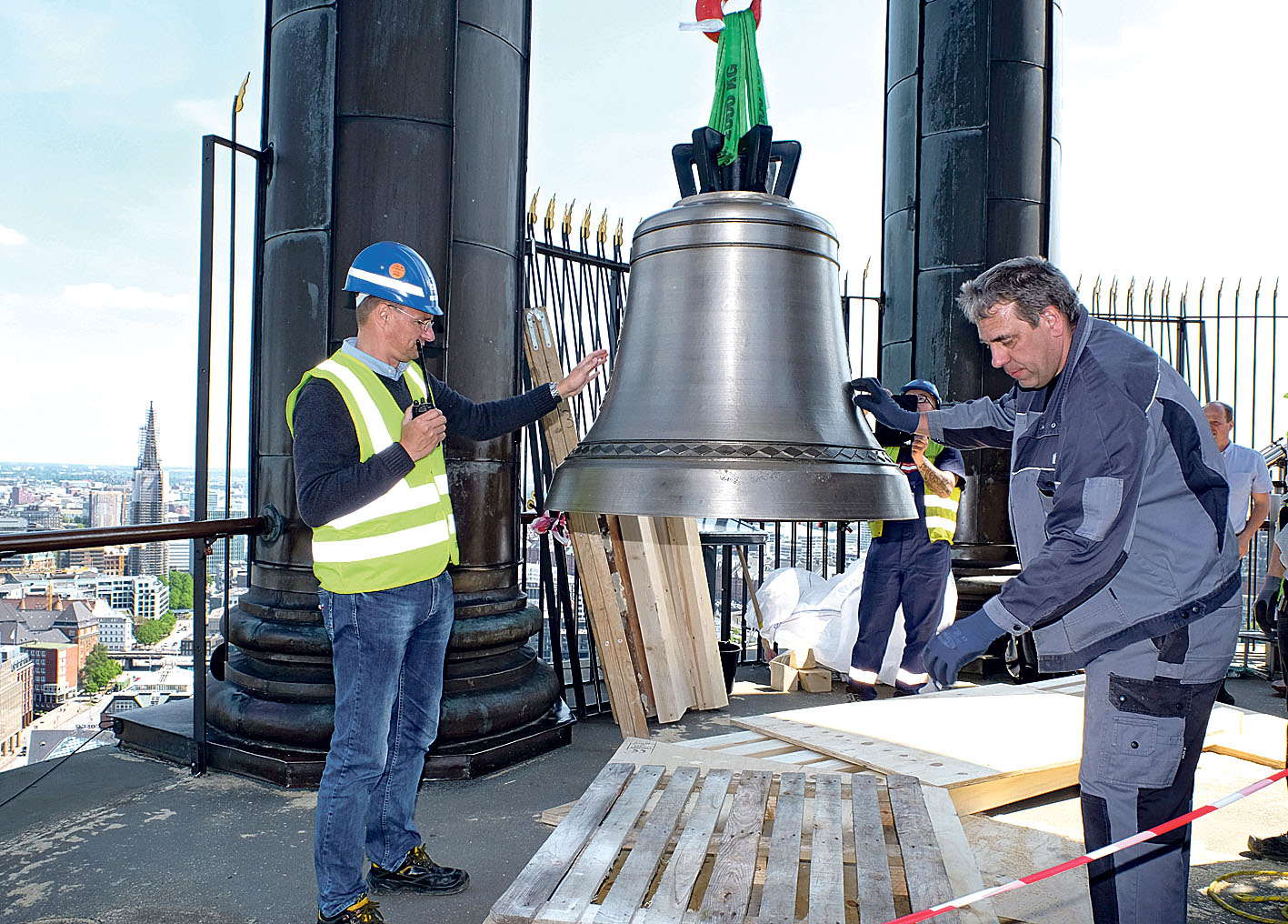 Eigentlich hätten die beiden Glocken schon seit Monaten im Turm hängen sollen – doch zu starke Winde hatten dies stets verhindert. Jetzt jedoch spielte das Wetter mit: Zum Start der Aktion lag ein prächtig blauer Himmel über Hamburg. „Oben auf dem Turm haben wir Windgeschwindigkeiten unter 20 km/h – der Deutsche Wetterdienst hatte keine Bedenken“, sagte Schindler. Einzig ein Sommergewitter hätte noch gefährlich werden können, weil dabei auch immer mit Böen gerechnet werden müsse. Doch Blitz und Donner blieben aus.