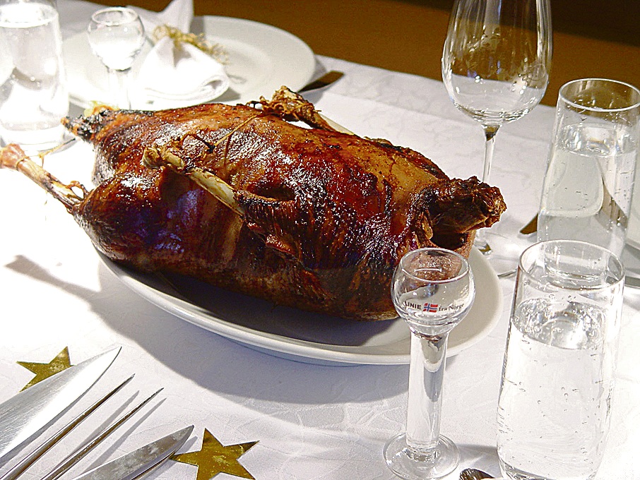 War diese Hürde genommen, kehrte zwar erstmal Ruhe ein (das Tier brutzelte in der Röhre friedlich vor sich hin). Als es dann aber an den Hauptgang ging (Suppe war bei uns Heiligabend obligatorisch), fing der Stress erst so richtig an: Erstens weil es nicht so einfach ist, so ein Tier zu zerteilen. Zweitens, weil natürlich jeder der um die Tafel versammelten Familienmitglieder (sieben an der Zahl) das von ihm gewünschte Stück bekommen sollte. Und drittens: Weil wir unbedingt vermeiden wollten, dass Fleisch, Gemüse und Klöße auf dem Teller des zuerst Versorgten kalt waren, eher der letzte seinen Teil abbekam. Hektik über Hektik. Von wegen gemütliches Beisammensein am weihnachtlich gedeckten Tisch!