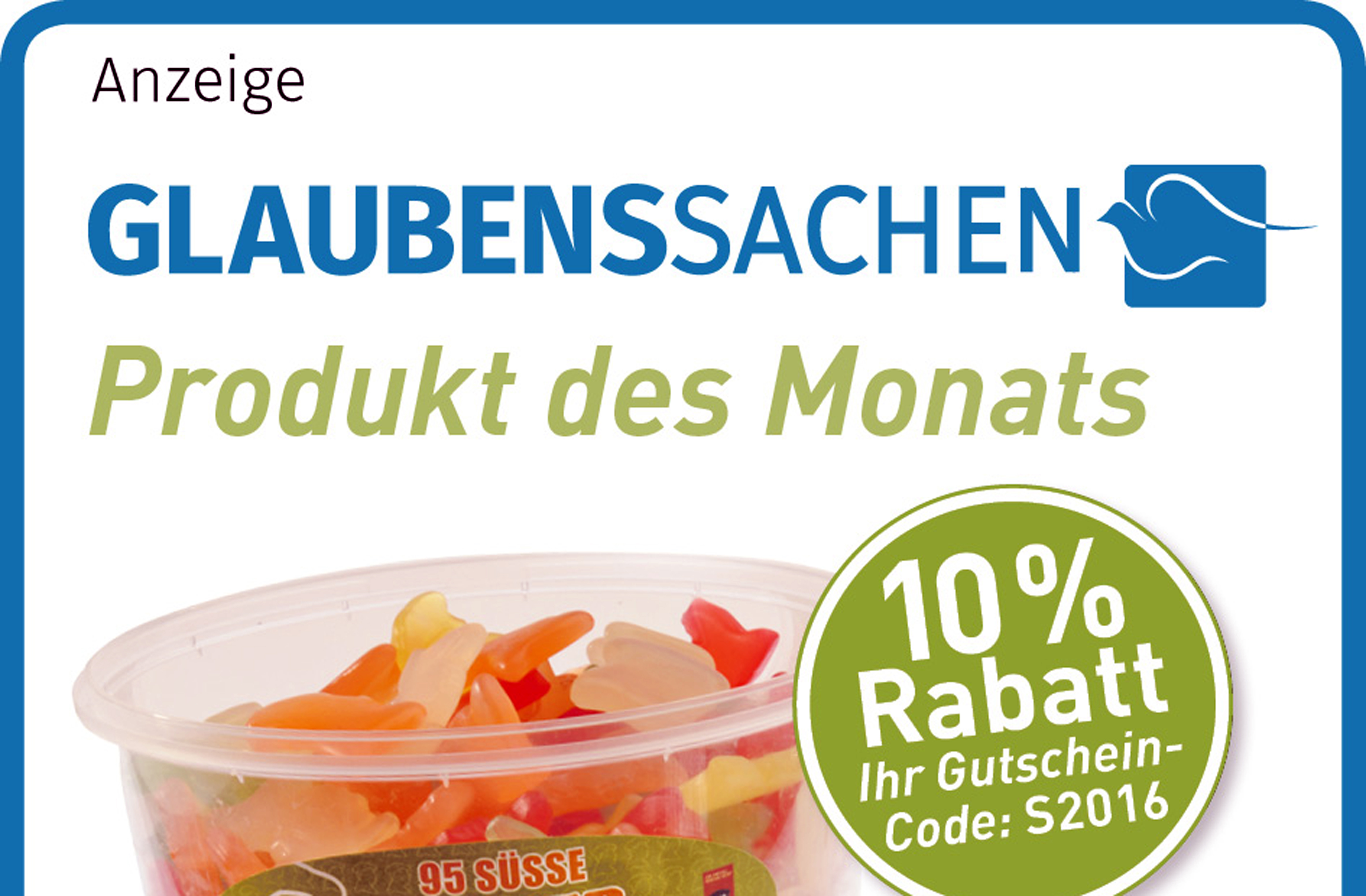 Exklusiv für Sie gibt es zehn Prozent Rabatt auf den Lutherbotschafter: Online einfach „S 2016“ eingeben und Geld sparen. Und hier geht’s mit einem Klick zum Produkt des Monats. Weitere schöne Geschenkideen zu Taufe, Hochzeit oder Geburtstag finden Sie www.glaubenssachen.de