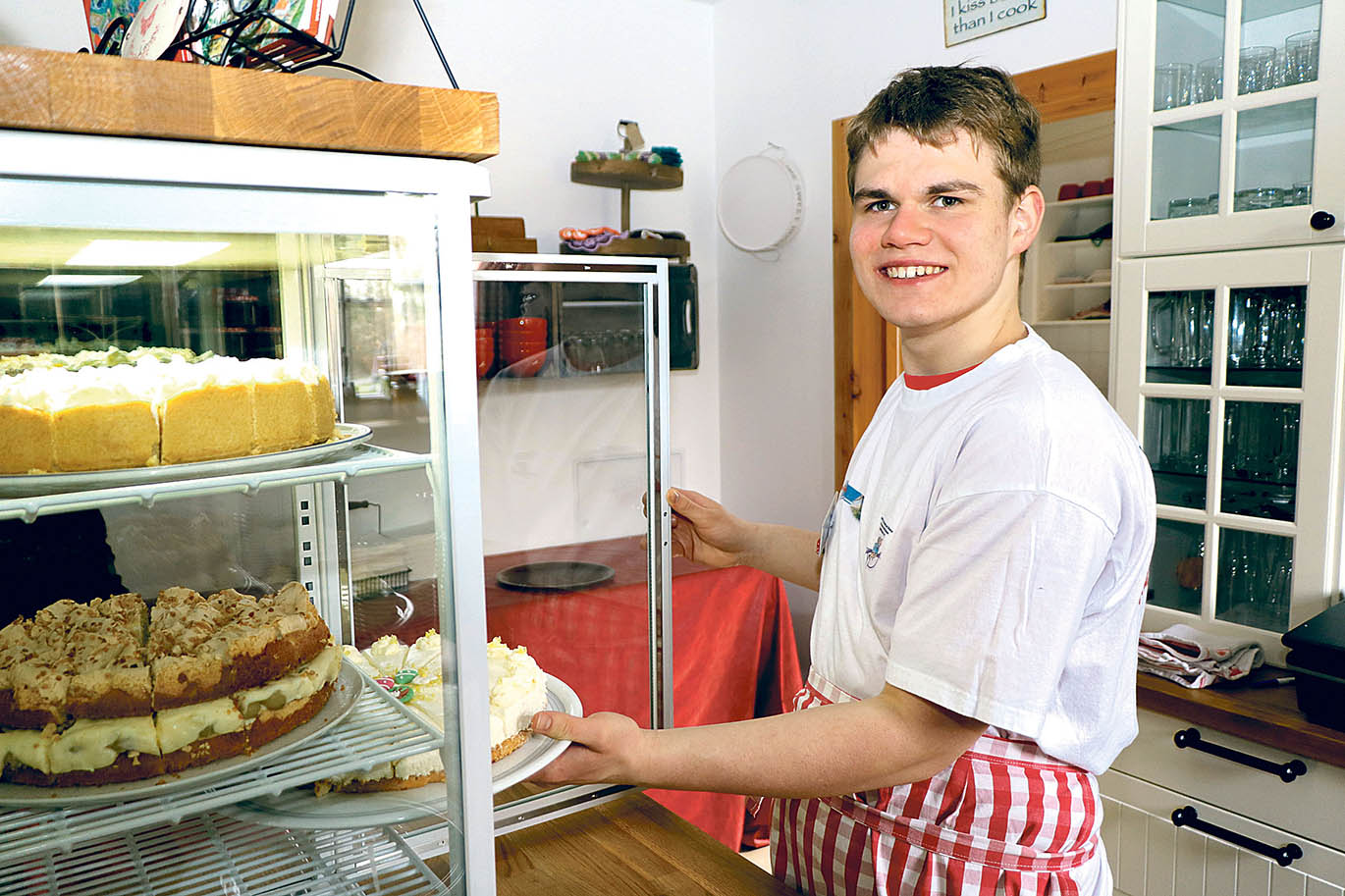 Christian stellt die Kuchen in den kleinen Kühlschrank auf der Kuchentheke. „Ich mach das voll gern hier“, sagt er. Er wuselt zwischen Küche, Theke und den gedeckten Tischen hin und her. Sergio stellt die vollen Kaffeekannen auf einen Tisch. „Ich würde heute gerne die Kuchen verteilen“, sagt er und stellt sich schon mal probeweise hin, prüft Teller und Tortenschaufeln.