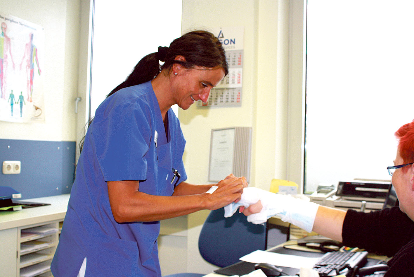 Soeben kommt eine Frau herein, die von einer Katze gebissen wurde. Der Arm muss ruhiggestellt werden, auch wenn nichts weh tut. Die dringend notwendigen Antibiotika möchte die Patientin lieber nicht einnehmen. Schwester Nicole erklärt noch einmal, dass das wirklich notwendig sei und sie weiter krankgeschrieben bleibt. Dann tritt ein Mann ein, der auf der Baustelle gestürzt ist und sich dabei mit dem Werkzeugkasten Bein und Fuß verletzt hat.