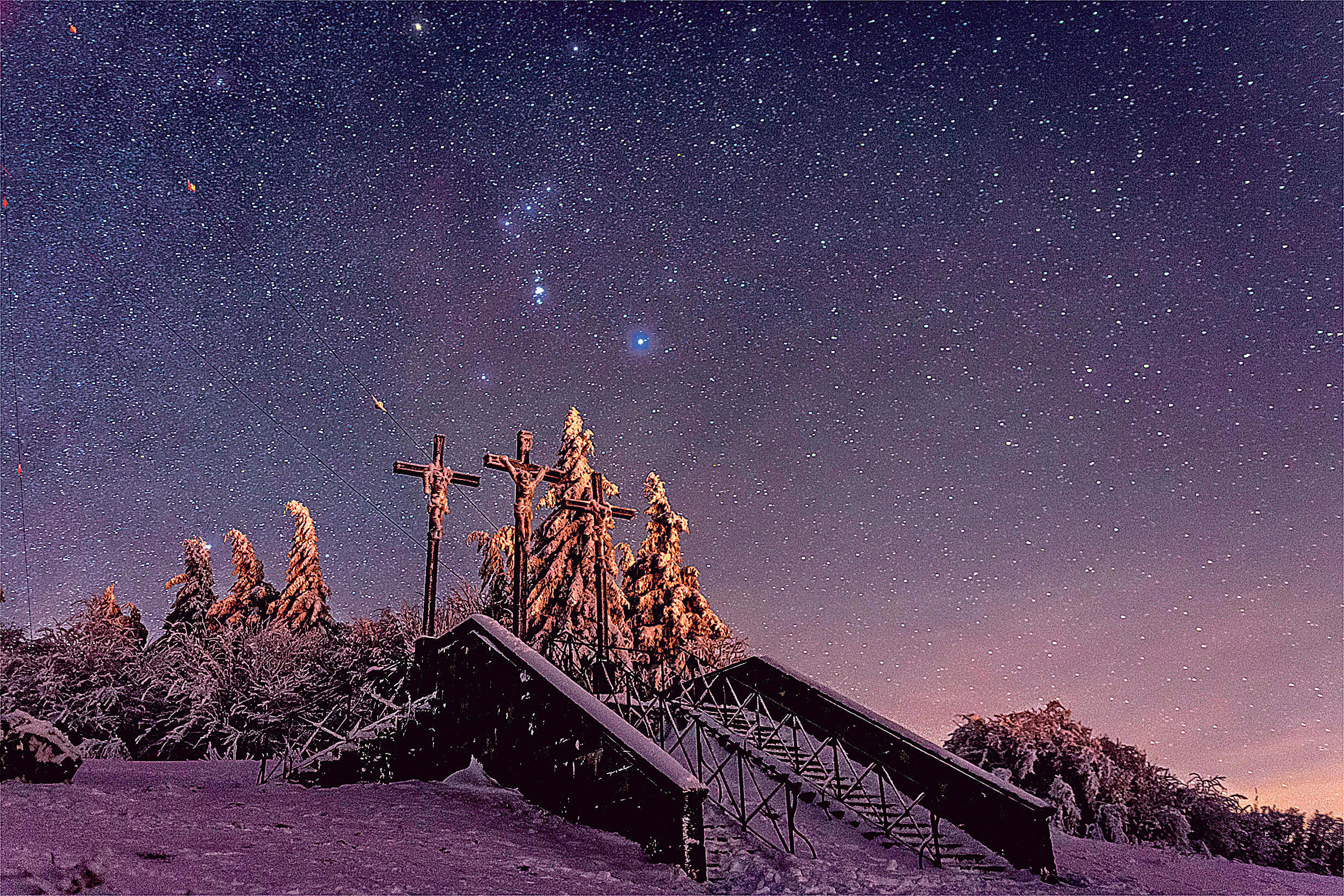 Fast alpin ist es hier oben. Ein kalter Wind umgibt mich. Ich nehme mir Zeit und genieße die ganz besondere Atmosphäre hier oben. Das Firmament wirkt wie ein unendlich großer Dom, aber ohne Wände – so umhüllt es uns ganz mit einer unendlichen Weite. Der gestirnte Himmel mit den Abertausenden Sternen über mir, und unter mir die Täler der Rhön, mit dem Gewöhnlichen des Alltags: Diese Komposition der Natur gibt mir das Gefühl, aus allen Niedrigkeiten enthoben zu sein. Hier oben ist der Alltag relativ. Diesen Abstand braucht es immer wieder. Alles erscheint in einem anderen Licht – dennoch entsteht dadurch wieder eine Nähe zum Leben in den Tälern des Lebens. Abstand schafft Nähe, das ist meine Erfahrung.