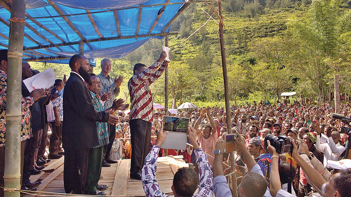 Ein Sonntag in Apahapsili, im Hochland von Westpapua in Ostindonesien: „Wai-jo hu-je – hinter den Bergen lebten wir, finster war es – wai-jo hu-je – Gott hat uns gefunden, hell strahlt jetzt sein Licht“, singen sie im Rhythmus ihrer alten Tanzlieder. Mit Blumenkränzen im Haar und leuchtend farbigen Tragnetzen auf dem Rücken tanzen Frauen und Kinder an der Spitze eines langen Zuges. Hinter ihnen eine Reihe kräftiger Männer, die schwere Kisten tragen. Den Zug beschließen rund hundert Gemeindeleiterinnen und Gemeindeleiter in festlichen Gewändern.