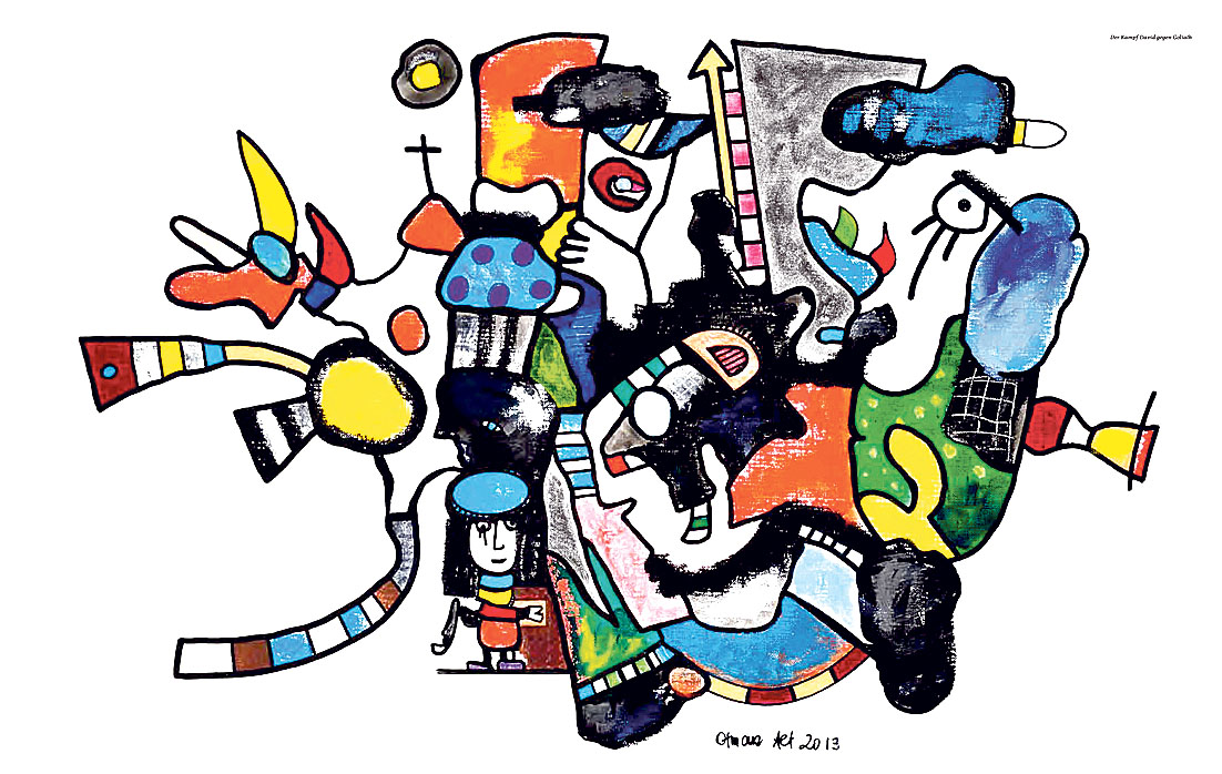 Diese drei Motive aus der Otmar-Alt-Bibel zeigen die Vielfalt von Alts künstlerischer Interpretation zu biblischen Texten. Die Bildtitel stammen vom Künstler selbst. Oben: „Himmelfahrt“; rechts: „David und Goliath“; links: „Erlösung“.