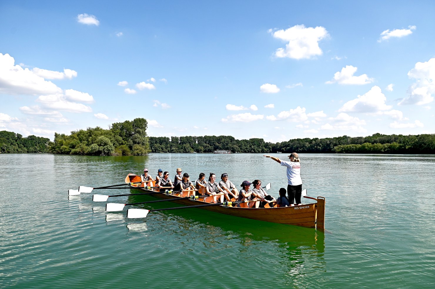 Ein bisschen nervös sitzen die jungen Damen auf den Rollsitzen von „Charlie“, einem großen Holzboot. „Den Riemen am Griff nehmen, Ruderblatt auf gestellte Position bringen“, kommandiert Beate Wettling. „Und jetzt!“, ruft die Steuerfrau mit dem weißen T-Shirt, auf dem groß „Kirchboot“ steht. Wasser spritzt auf, die Ruder graben ins Dunkelgrün des Angelhofer Altrheins, der zwischen Speyer und Otterstadt liegt. Schon nach wenigen Metern haben die Ruderer auf wundersame Weise ihren Takt gefunden. Schnell gewinnt das mehr als zehn Meter lange Boot an Fahrt. Ein lautes „Juchhu“ schallt übers Wasser, alle sind im Rhythmus, ziehen gemeinsam in die gleiche Richtung.