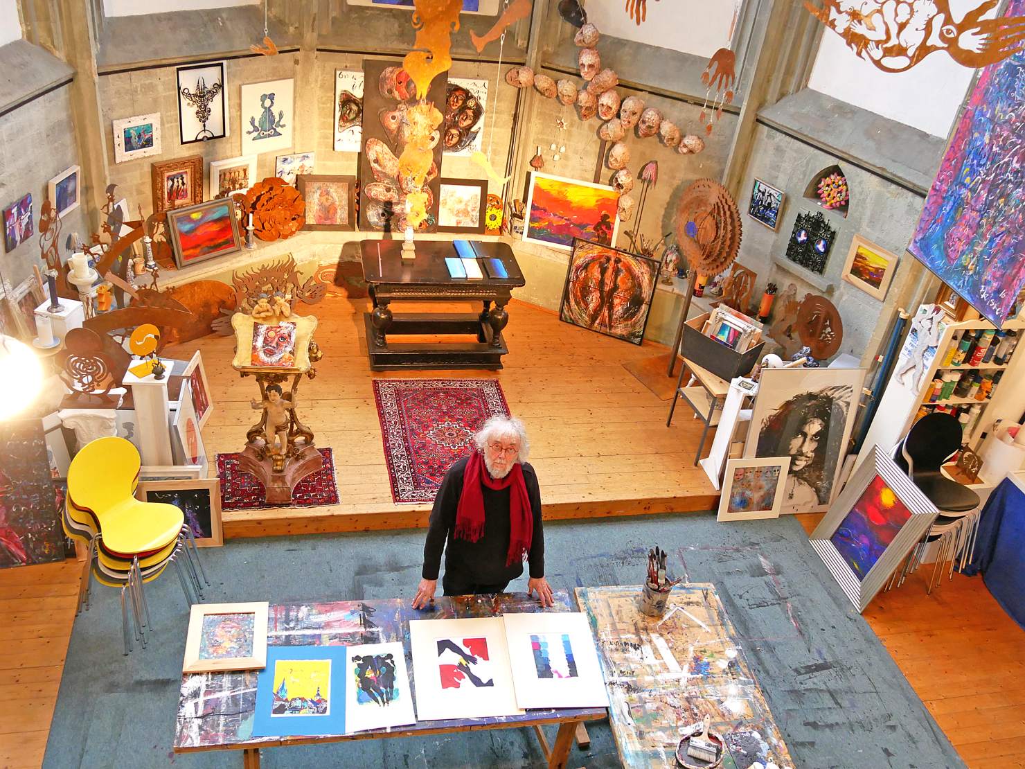 Von Anfang an war es ihm dabei wichtig, dass sein Atelier für Besucherinnen und Besucher offen ist. Wenn draußen an der Kirchentür das Schild hängt „Bin da!“, darf jeder eintreten, dem Künstler bei der Arbeit zusehen, mit ihm reden und sich vielleicht seine Werke erklären lassen. „Und im Idealfall tritt dann der Glücksfall ein, den ich KUNST nenne, nämlich das, was sich zwischen dem Stück Papier, der Leinwand, mit ein wenig Farbe, oder einer Skulptur und Ihren Augen abspielt, und das können bei gleichen Werken bei verschiedenen Menschen durchaus unterschiedliche Wahrnehmungen sein“, beschreibt er seinen künstlerischen Ansatz.